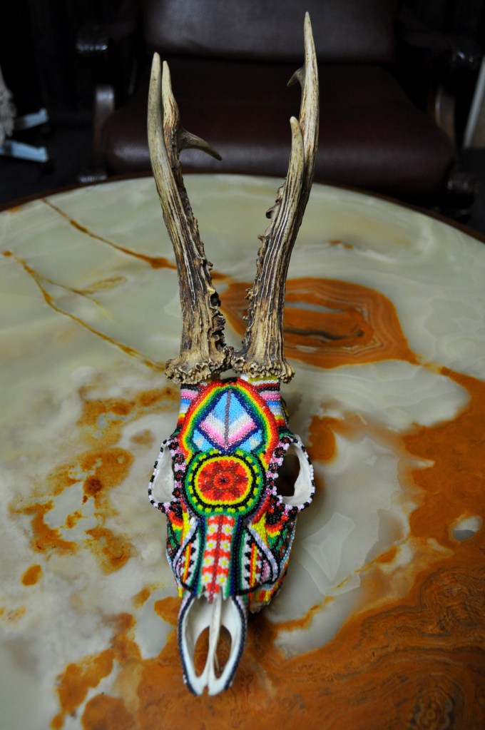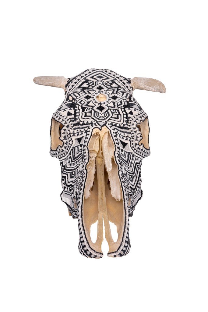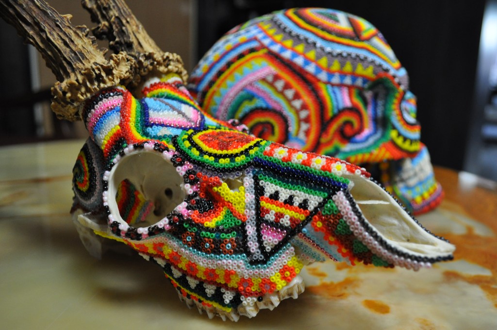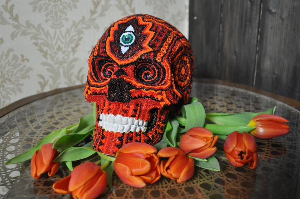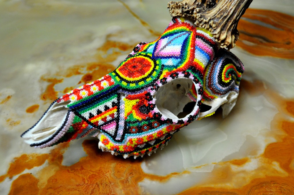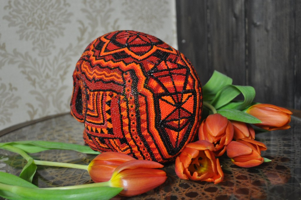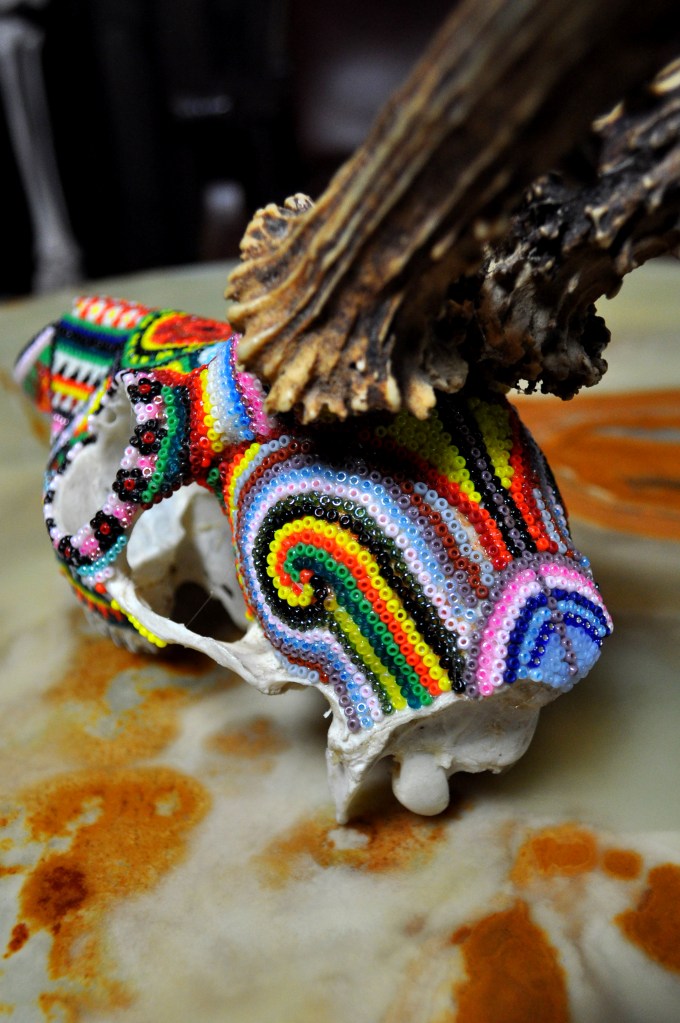 The patterns found on my beaded works are mainly mandalas, which are symmetrically repeated motifs placed on a circular plan. Mandala symbols are among the oldest religious symbols of humanity, they also appear in yogic practices, astrology, architecture, and magic. We find them in all peoples and cultures. Personally, I love to draw, tattoo, and bead them. It’s a form of meditation for me. The remaining patterns and colors are an expression of my fascination with ethnic prints and colors, mainly from Africa and South America. Inspiration for creating skulls comes mainly from the art of the Huichol Indians.