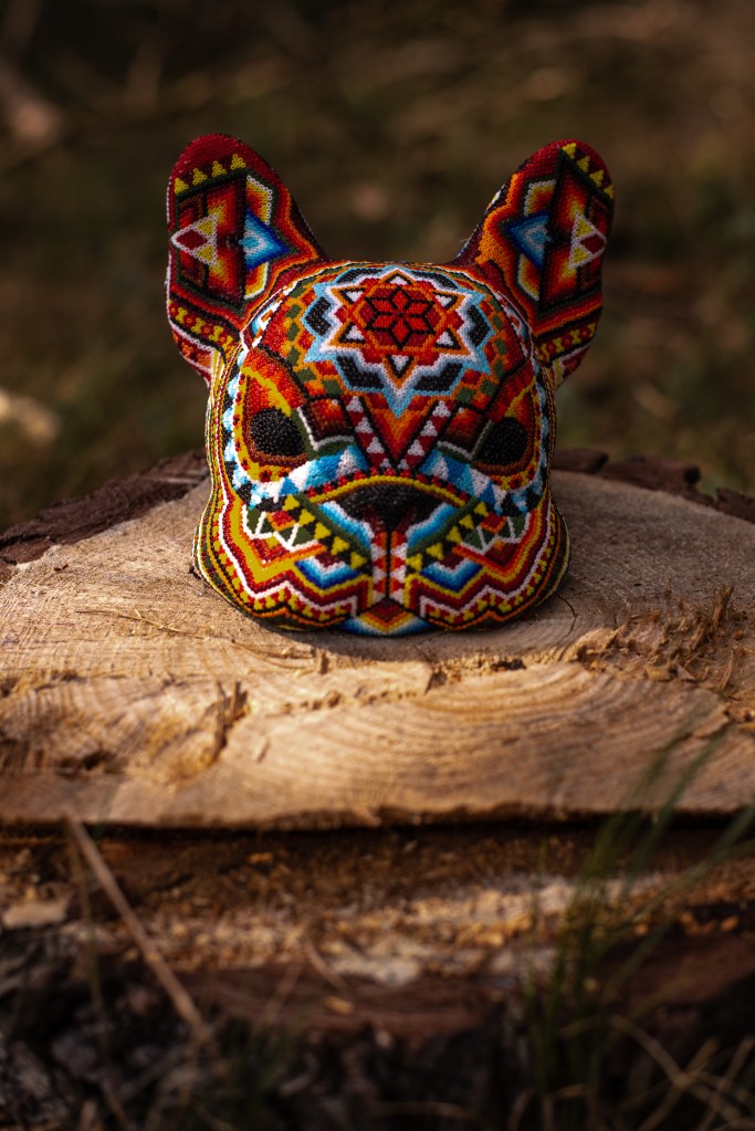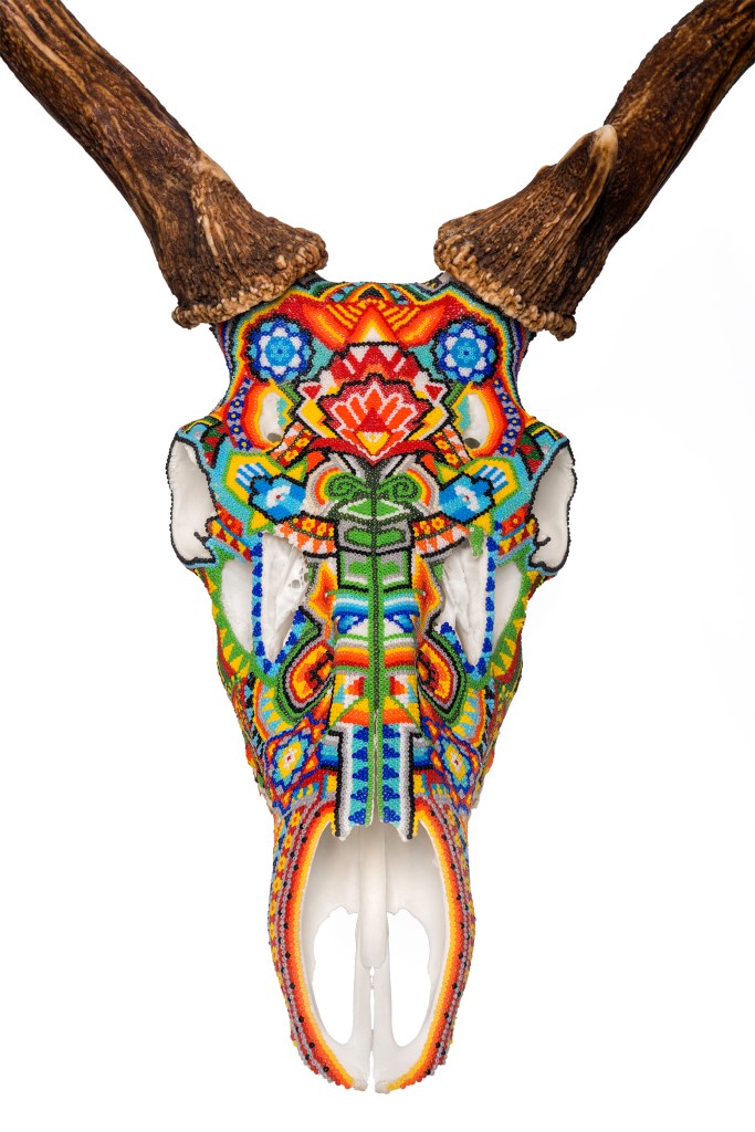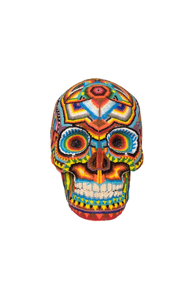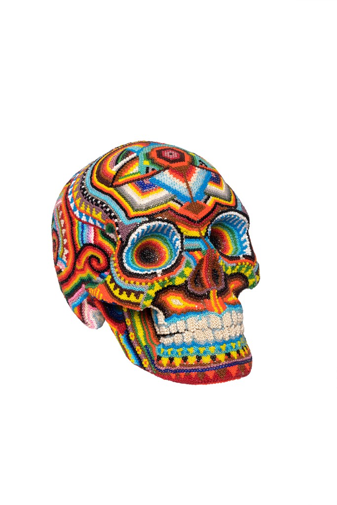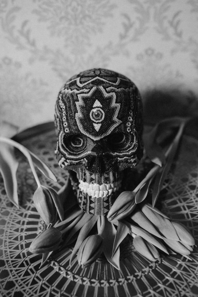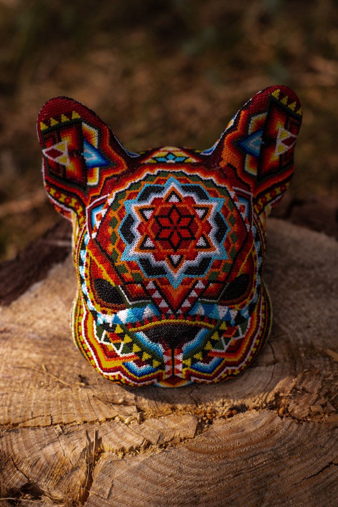 The patterns found on my beaded works are mainly mandalas, which are symmetrically repeated motifs placed on a circular plan. Mandala symbols are among the oldest religious symbols of humanity, they also appear in yogic practices, astrology, architecture, and magic. We find them in all peoples and cultures. Personally, I love to draw, tattoo, and bead them. It’s a form of meditation for me. The remaining patterns and colors are an expression of my fascination with ethnic prints and colors, mainly from Africa and South America. Inspiration for creating skulls comes mainly from the art of the Huichol Indians.