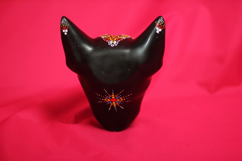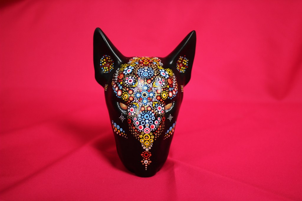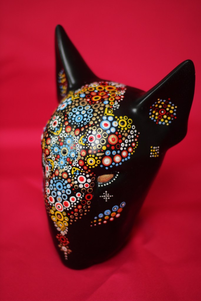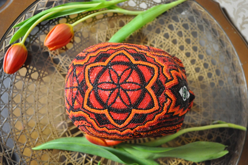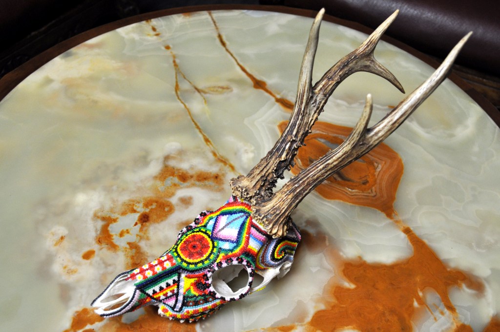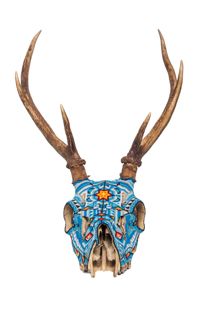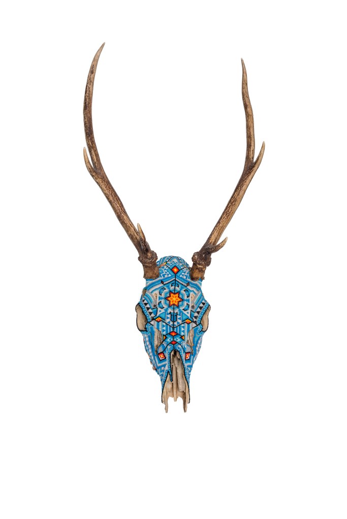 The patterns found on my beaded works are mainly mandalas, which are symmetrically repeated motifs placed on a circular plan. Mandala symbols are among the oldest religious symbols of humanity, they also appear in yogic practices, astrology, architecture, and magic. We find them in all peoples and cultures. Personally, I love to draw, tattoo, and bead them. It’s a form of meditation for me. The remaining patterns and colors are an expression of my fascination with ethnic prints and colors, mainly from Africa and South America. Inspiration for creating skulls comes mainly from the art of the Huichol Indians.